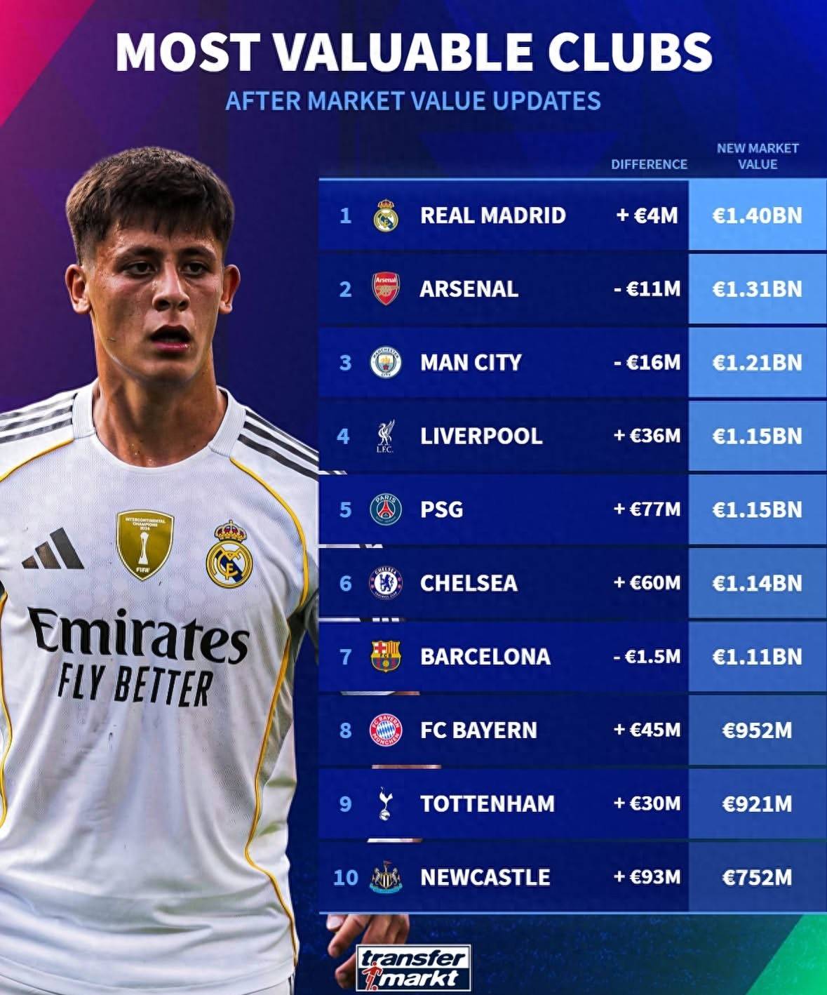 皇马无疑稳居榜首,这一点并不令人感到意外。14亿欧元的身价,成为了整个足坛的话题焦点。如今的皇马,已不再仅仅是“银河战舰”的代名词,而是一个全新的、更加豪华的版本。球队的首发阵容几乎全是世界顶级球员,而替补席上,同样坐着几位身价过千万欧元的球员,这种深厚的阵容深度使得其他豪门望尘莫及。皇马的成功并非偶然,近年来,俱乐部通过精准的转会操作,加之青训体系的不断优化,逐渐形成了良性的循环。老将们仍能保持高水平,年轻球员的快速成长更是为球队注入了源源不断的活力。这种新老交替的完美平衡,正是皇马登顶身价榜的关键所在。