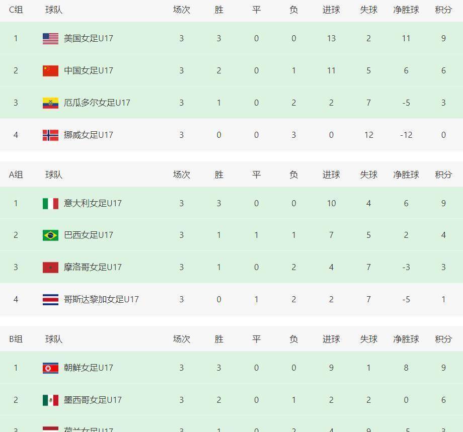 本届U17女足世界杯首次扩军至24队,赛制调整为小组前两名及四个最佳第三名晋级。 中国队所在的C组中,美国队三战全胜狂轰13球头名出线,挪威三连败垫底出局。