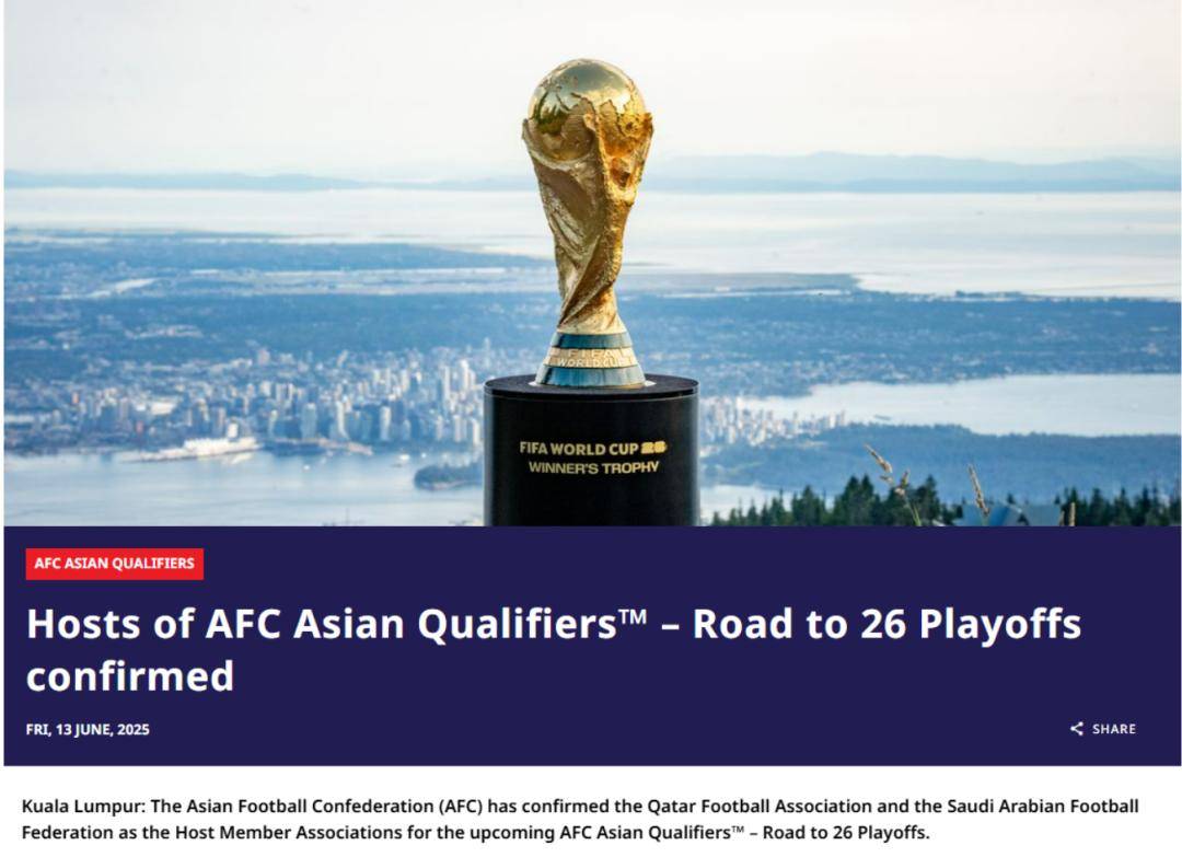 但亚足联并没有将比赛放在这两地,也没有放在中立场地,而是直接指定由卡塔尔和沙特阿拉伯主办。