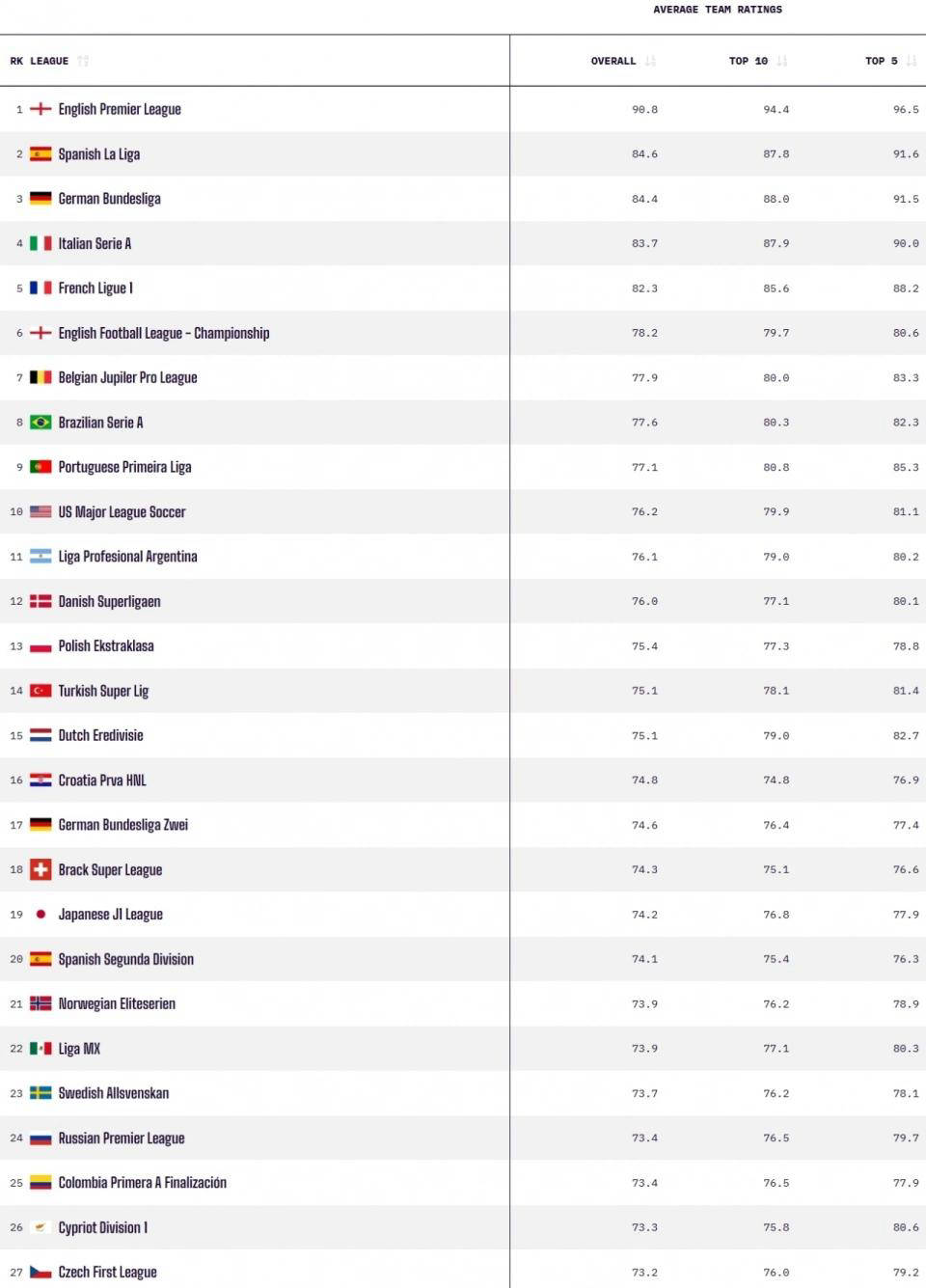 值得注意的是,英格兰的次级联赛英冠竟然跻身第6位,压过比甲、巴甲和葡超等其他传统足球强国的主要联赛。而梅西所在的美国职业足球大联盟则排名第10。