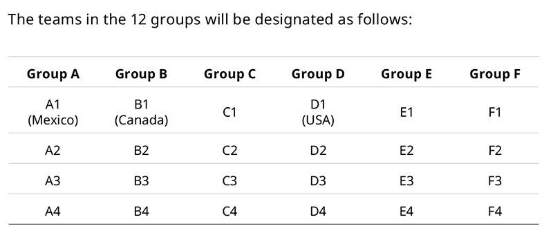 除了东道主的分组已经确定外,其他所有晋级的球队将根据国际足联最新的排名,被划分到四个档次,每个档次包含12支球队。四个档次将分别对应小组赛中的四个位置。不过,来自数据机构Football Meets Data的消息透露,国际足联对于附加赛球队的分档规则并没有明确说明,这似乎留给了附加赛球队一些不确定的空间。