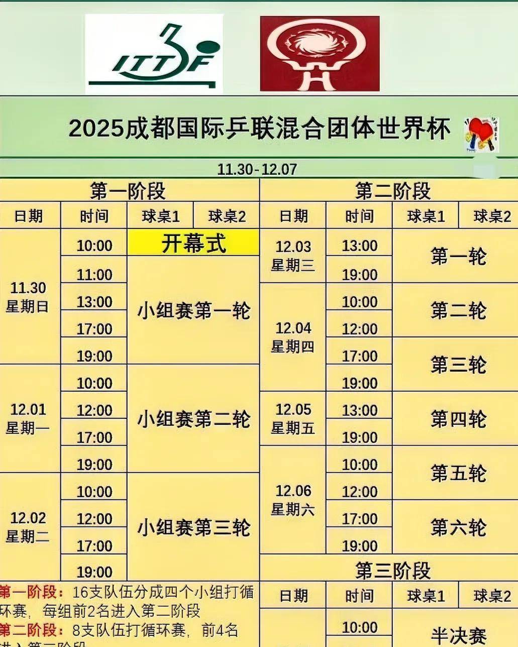 12月7日是决赛日,上午半决赛,晚上打铜牌赛和冠军战。揭幕战是11月30日晚上7点半,中国队对埃及队。12月4日晚上8点,估计会有一场中日混双焦点战,张本兄妹很可能上场。