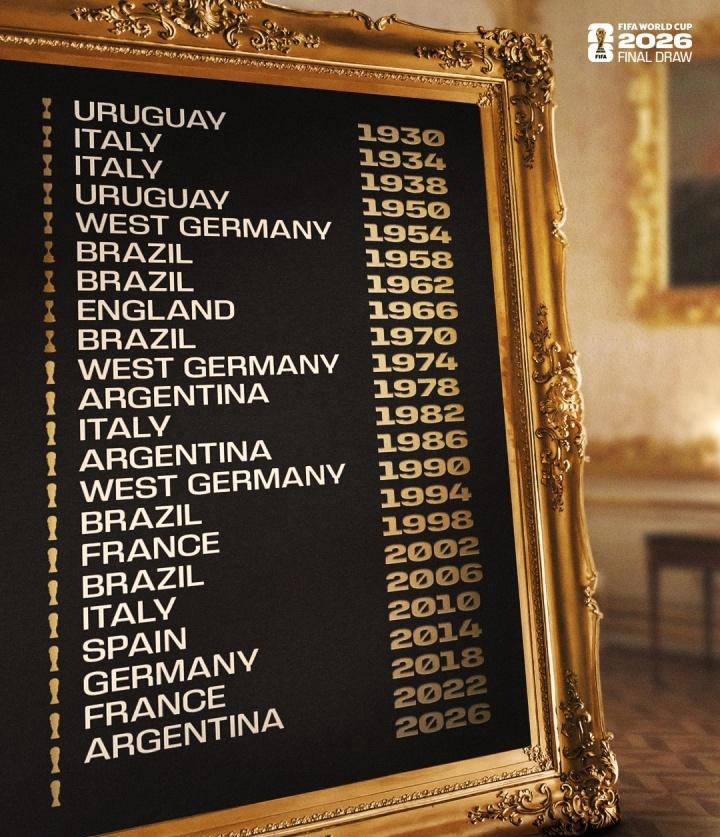 国际足联专门发布了一张历届冠军海报,从最先登顶的乌拉圭到如今的卫冕冠军阿根廷,盘点全球仅有的8个冠军国。南美三强巴西、阿根廷、乌拉圭,加上欧洲劲旅德国、意大利、法国和英格兰,都已确认参战,仅剩意大利待附加赛尘埃落定。海报更引发思考:新王即将诞生?
