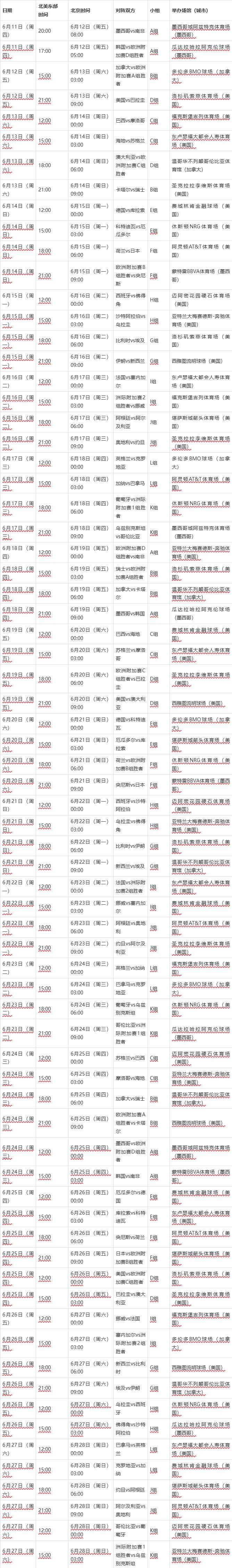 完整小组赛赛程(含北京时间,北美东部时间为夏令时,与北京时间时差12小时)