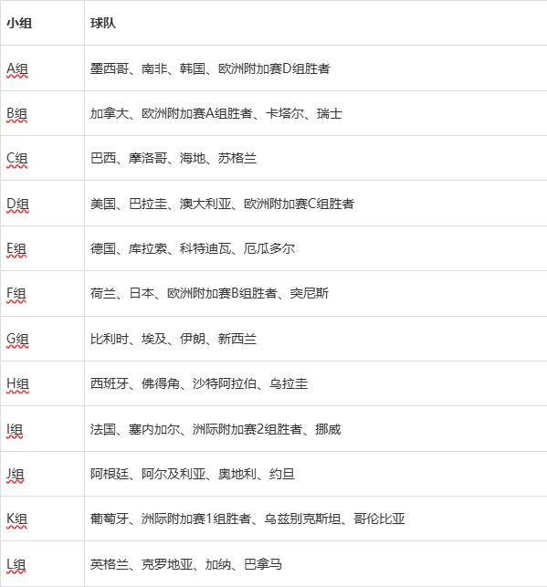 全部小组的分组情况已在最终抽签中确定,东道主球队为种子队(墨西哥分在A组、加拿大分在B组、美国分在D组),西班牙、阿根廷、法国、英格兰等顶级强队在赛事后期才会碰面。剩余的参赛名额将由2026年3月进行的附加赛球队填补。