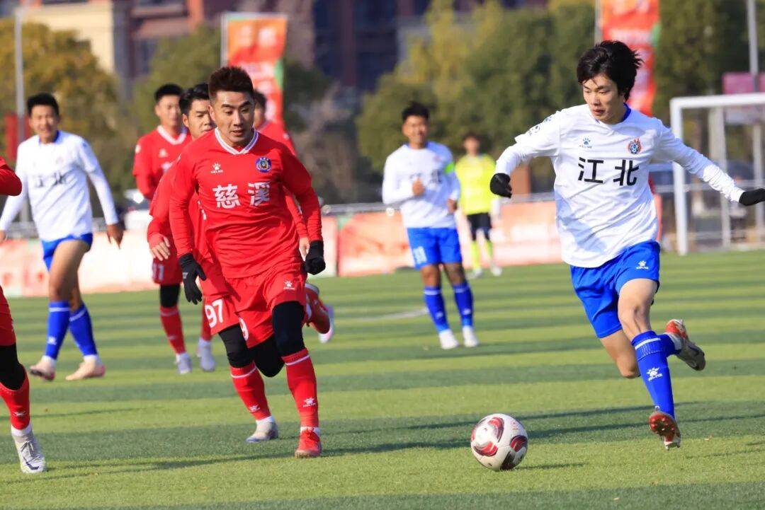 上半场开始,两队迅速进入比赛节奏。慈溪队多次依靠定位球、角球造成威胁。江北队则凭借传控,在场上占据一定优势。半节战罢,双方均未进球。