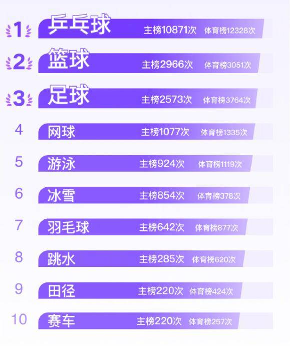 最后,将目光投向最受欢迎的体育项目。毫无疑问,乒乓球以绝对优势领跑,在主榜上获得了高达10871次热搜,在体育榜上更是达到了12328次。篮球(主榜2966次,体育榜3051次)和足球(主榜2573次,体育榜3764次)紧随其后。网球、游泳、冰雪运动、羽毛球、跳水、田径以及赛车也分别占据了一席之地,展现了体育运动的多样性和广泛的受众基础。