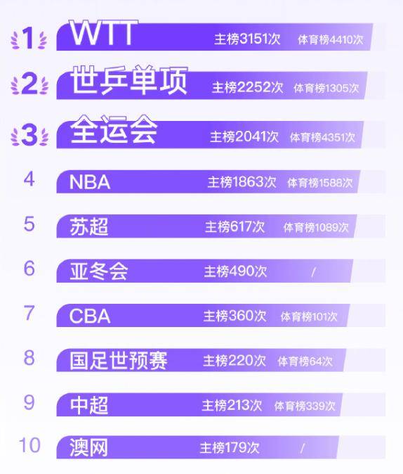再来看看备受瞩目的体育赛事。WTT世界乒乓球职业大联盟赛事以3151次主榜热搜和4410次体育榜热搜的傲人成绩,高居榜首。紧随其后的是世乒赛单项赛(主榜2252次,体育榜1305次)和全运会(主榜2041次,体育榜4351次)。此外,NBA、苏格兰足球超级联赛、亚洲冬季运动会、中国男子篮球职业联赛CBA、国足世界杯预选赛、中国足球协会超级联赛和澳大利亚网球公开赛也榜上有名,共同构成了2025年最受关注的体育赛事图景。