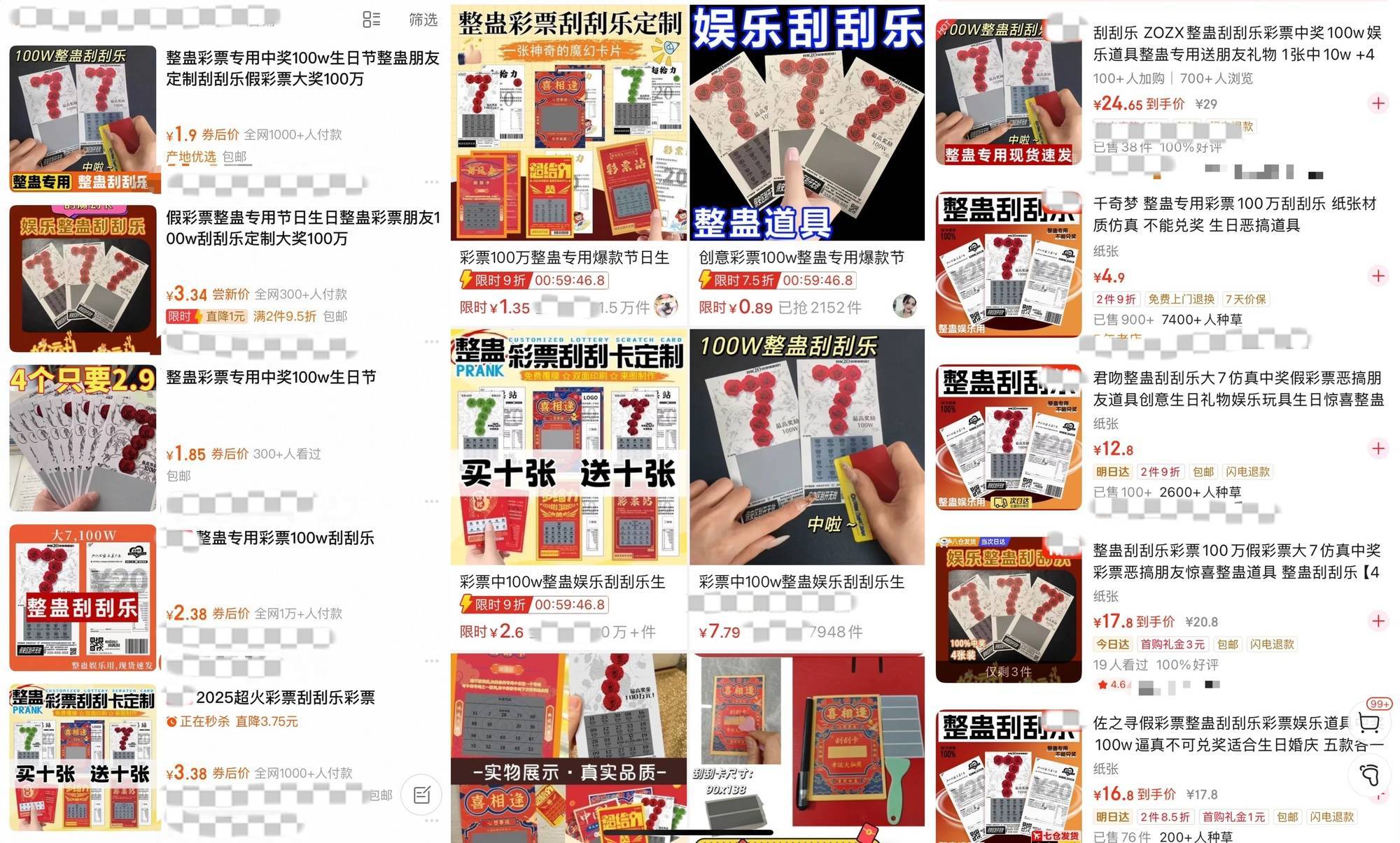 记者搜索发现,这类“道具彩票”在各大电商平台公开销售,且销量可观,通常设置“100万元”“20万元”“10万元”“未中奖”等金额不等的选项。有商家在宣传视频中介绍,产品“还原度直接拉满,票面材质、字体颜色、奖项设计和正规彩票一模一样,先让朋友体验一夜暴富的极致狂喜,再用隐藏小字解锁爆笑反转,搞怪又不伤人”。