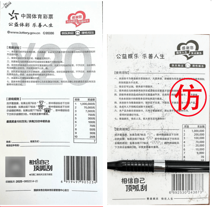 实际上,这些“整蛊彩票”以即开型体育彩票为主。根据国家体育总局体育彩票管理中心发布的声明,即开型体育彩票使用环保纸张和油墨,绿色、健康、易刮开;保安区和刮开区均有覆膜,票面印有防伪装饰纹,图案完整;票面印有体彩、“顶呱刮”标识及面值金额,刮开后的游戏区域有防伪底纹,且游戏符号、奖金标志清晰易辨别。票背印有发行机构、公益金贡献金额和官方网址等信息。